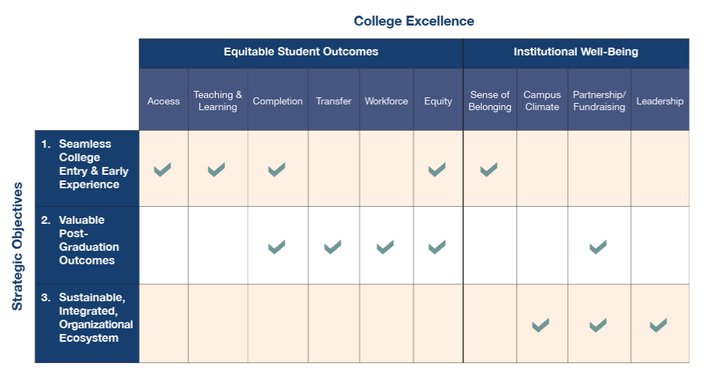 These metrics do not exist in a vacuum. The three objectives in the college’s current strategic plan (Strategic Educational Continuity Plan) map to several facets of the College’s Excellence Indicators. For example, Objective 1 (Seamless College Entry & Early Experience) maps to Access, Teaching & Learning, Completing, and Equity, as well as Sense of Belonging metrics. In this way, we ensure that the strategic objectives advances the ultimate outcomes that reflect the college’s mission and vision.