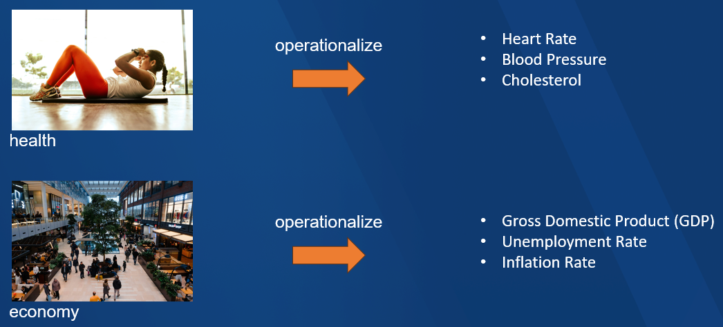Think of it like this: You cannot directly measure how “healthy” you are by looking in a mirror, but your doctor can check specific indicators like your blood pressure, heart rate, and cholesterol levels. Each of these measurements gives insight into your overall health status. Similarly,