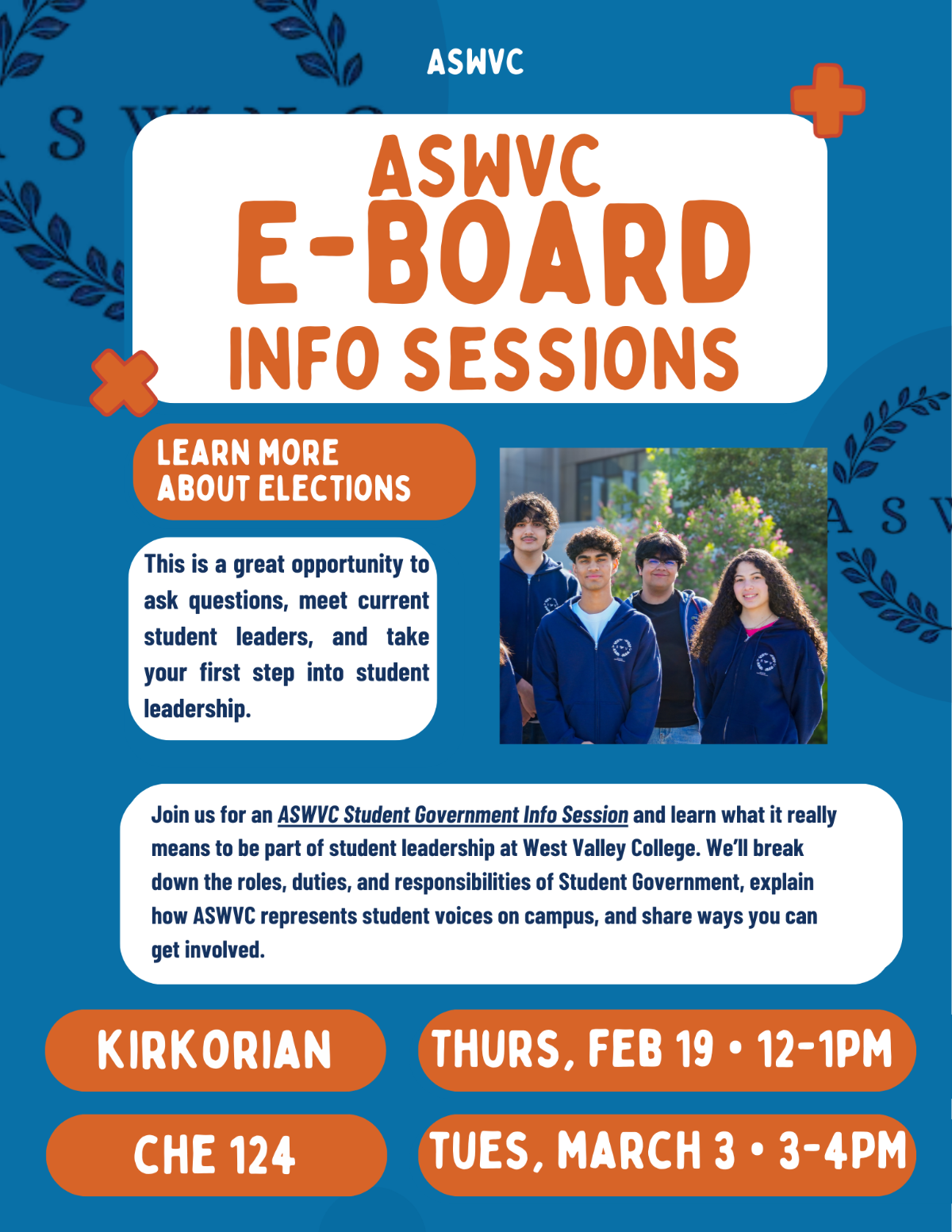 The Associated Students of West Valley College (ASWVC) will be accepting applications for Executive Board positions soon! These roles offer you the chance to represent your peers, collaborate with campus leaders, and create engaging experiences for our community. Serving on the Executive Board allows you to build leadership and professional skills while making a meaningful impact on the West Valley community.